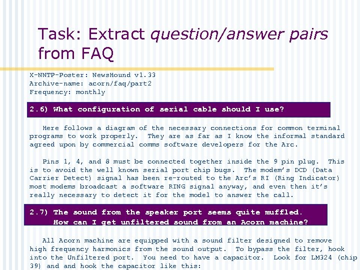 Task: Extract question/answer pairs from FAQ X-NNTP-Poster: News. Hound v 1. 33 Archive-name: acorn/faq/part 2 Frequency: monthly 2. 6) What configuration of serial cable should I use? Here follows a diagram of the necessary connections for common terminal programs to work properly. They are as far as I know the informal standard agreed upon by commercial comms software developers for the Arc. Pins 1, 4, and 8 must be connected together inside the 9 pin plug. This is to avoid the well known serial port chip bugs. The modem’s DCD (Data Carrier Detect) signal has been re-routed to the Arc’s RI (Ring Indicator) most modems broadcast a software RING signal anyway, and even then it’s really necessary to detect it for the model to answer the call. 2. 7) The sound from the speaker port seems quite muffled. How can I get unfiltered sound from an Acorn machine? All Acorn machine are equipped with a sound filter designed to remove high frequency harmonics from the sound output. To bypass the filter, hook into the Unfiltered port. You need to have a capacitor. Look for LM 324 (chip 39) and hook the capacitor like this: