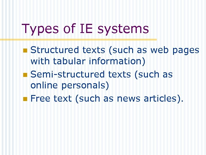 Types of IE systems Structured texts (such as web pages with tabular information) n Semi-structured texts (such as online personals) n Free text (such as news articles). n