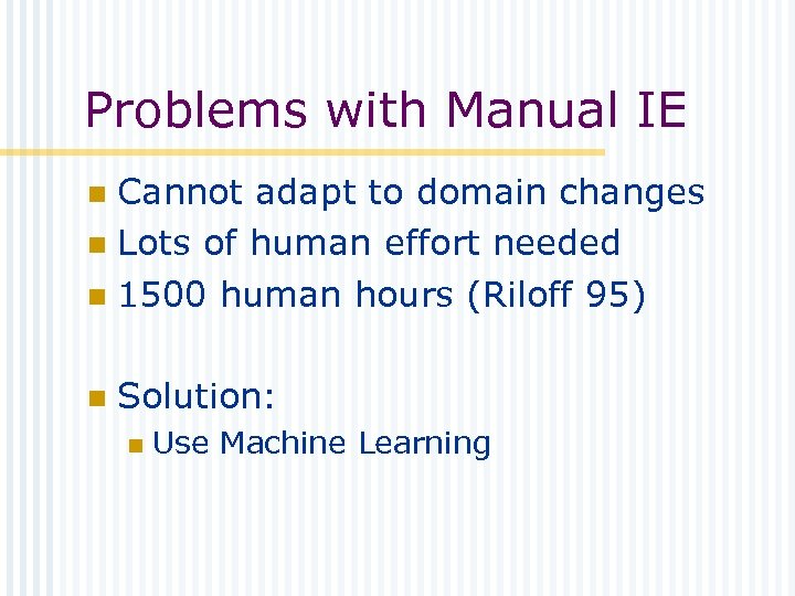 Problems with Manual IE Cannot adapt to domain changes n Lots of human effort needed n 1500 human hours (Riloff 95) n n Solution: n Use Machine Learning