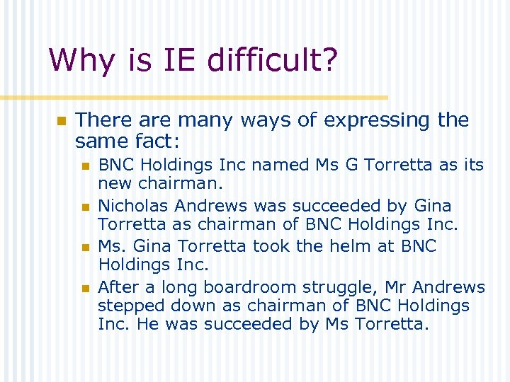 Why is IE difficult? n There are many ways of expressing the same fact: n n BNC Holdings Inc named Ms G Torretta as its new chairman. Nicholas Andrews was succeeded by Gina Torretta as chairman of BNC Holdings Inc. Ms. Gina Torretta took the helm at BNC Holdings Inc. After a long boardroom struggle, Mr Andrews stepped down as chairman of BNC Holdings Inc. He was succeeded by Ms Torretta.