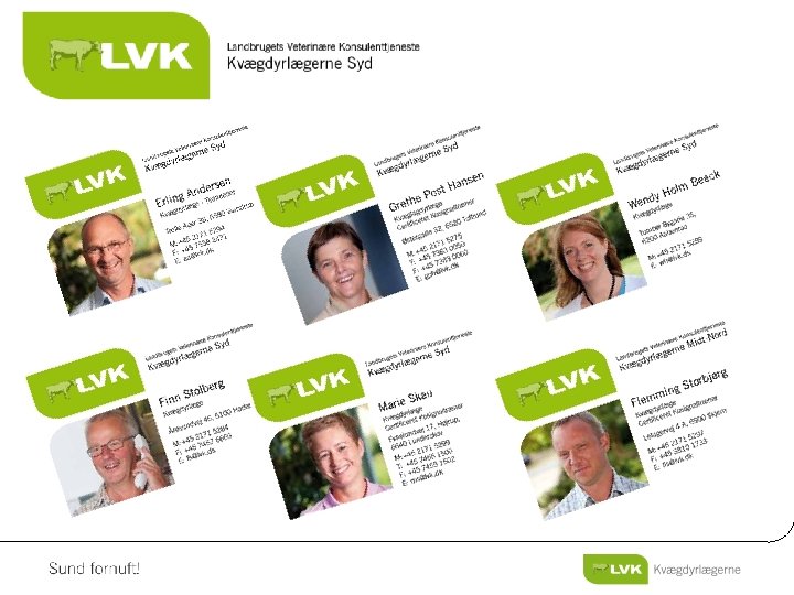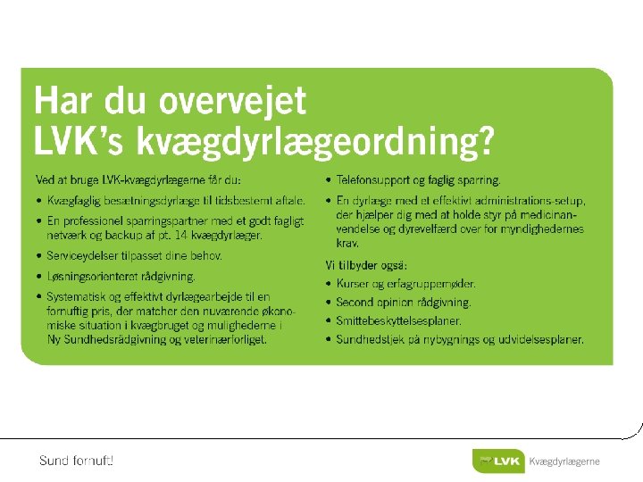 Fremtiden • Veterinærforliget – Færre og stører kvægbrug med mange ansatte – Mere rådgivning/forebyggelse/dyrevelfærd – Kontrol af egenkontrol i besætningerne – Smittebeskyttelse – Kvægbrugere får mere adgang til selv at behandle besætningsdiagnoser • Flere kunder og flere kvægdyrlæger • Vor dyrlægemodel passer godt til denne udvikling