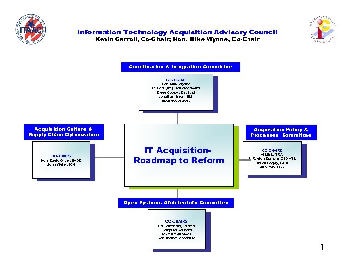 Information Technology Acquisition Advisory Council Kevin Carroll, Co-Chair; Hon. Mike Wynne, Co-Chair Coordination & Integration Committee CO-CHAIRS Hon. Mike Wynne Lt. Gen. (ret) Jack Woodward Steve Cooper, Strativst Jonathan Breul, IBM Business of govt. Acquisition Culture & Supply Chain Optimization CO-CHAIRS Hon. David Oliver, EADS John Weiler, ICH Acquisition Policy & Processes Committee IT Acquisition. Roadmap to Reform CO-CHAIRS Al Mink, SRA J. Raleigh Durham, OSD ATL Chuck Corjay, CACI Gino Magnifico Open Systems Architecture Committee CO-CHAIRS Ed Hammersla, Trusted Computer Solutions Dr. Marv Langston Rob Thomas, Accenture 1