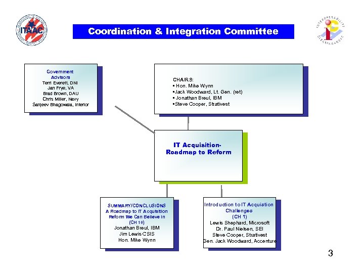 Information Technology Acquisition Advisory Council Kevin Carroll, Co-Chair; Hon. Mike Wynn, Co-Chair Coordination & Integration Committee Acquisition Culture & Supply Chain Optimization Committee SUMMARY/CONCLUSIONS A Roadmap to IT Acquisition Reform we can believe in (CH 10) Introduction to IT Acquistion Challenges (CH 1) Acquisition Policy & Processes Committee Acquisition Work Force; Overwhelmed and Uninformed (CH 9) IT Policy (CH 2) IT Acquisition. Roadmap to Reform Acquisition Leadership, Accountability & Transparency (CH-8 Requirements, Architecture & Acq Process Reform (CH 3) Open Systems Architecture Committee IT Eco-system Value Chain Contribution and Incentive (CH-7) “We don’t need no stinking Requirements- Just Buy It” CH- 4 How Requirements Over. Specifications Undermine COTS/Open Source (CH-6) ‘Why programs fail to leverage standards; Innovations” (CH-5) 2