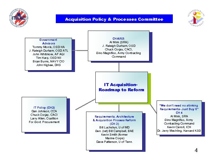 Coordination & Integration Committee Government Advisors Terri Everett, DNI Jan Frye, VA Brad Brown, DAU Chris Miller, Navy Sanjeev Bhagowaia, Interior CHAIRS: • Hon. Mike Wynn • Jack Woodward, Lt. Gen. (ret) • Jonathan Breul, IBM • Steve Cooper, Strativest IT Acquisition. Roadmap to Reform SUMMARY/CONCLUSIONS A Roadmap to IT Acquisition Reform We Can Believe In (CH 10) Jonathan Breul, IBM Jim Lewis CSIS Hon. Mike Wynn Introduction to IT Acquistion Challenges (CH 1) Lewis Shephard, Microsoft Dr. Paul Nielsen, SEI Steve Cooper, Strativest Gen. Jack Woodward, Accenture 3