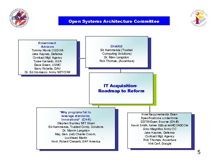 Acquisition Policy & Processes Committee Government Advisors Tommy Morris, OSD HA J. Raleigh Durham, OSD ATL John Whitmore, AF AQI Tim Harp, OSD NII Brian Burns, NAVY CIO John Higbee, DHS CHAIRS: Al Mink (SRA) J. Raleigh Durham, OSD Chuck Corjay, CACI, Gino Magnifico, Army Contracting Command IT Acquisition. Roadmap to Reform IT Policy (CH 2) Dan Johnson, CCA Chuck Corjay, CACI Larry Allen, Coalition For Govt. Procurement Requirements, Architecture & Acquisition Process Reform (CH 3) Bill Luchshyn, U of MD Gen. (ret) Bill Campbell, BAE Kevin Smith (former Marine Corps) Dave Patterson, U of Tenn. “We don’t need no stinking Requirements- Just Buy It” CH 4 Al Mink, SRA Gino Magnifico, Army Contracting Command Kevin Carroll, ICH Dr. Jerry Mechling, Harvard KSG 4