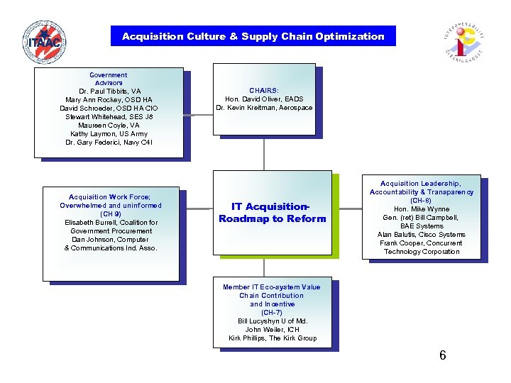 Open Systems Architecture Committee Government Advisors Tommy Morris OSD HA Jake Haynes, Defense Contract Mgt. Agency Tyree Varnado, GSA Dave Green, USMC Barry Robella, DAU Dr. Ed Siomacco, Army NETCOM CHAIRS: Ed Hammersla (Trusted Computing Solutions) Dr. Marv Langston Rob Thomas, (Accenture) IT Acquisition. Roadmap to Reform ‘Why programs fail to leverage standards; Innovations” (CH-5) Stephen Buckley MIT Sloan Ed Hammersla, Trusted Comp. Solutions Dr. Marvin Langston Maj. Gen. (ret) Charlie Croom, Lockheed Martin Honl. Robert Cresanti, SAP America How Requirements Over. Specifications undermine COTS/Open Source (CH-6) Kevin Smith, former SE&I at MARCORSCOM Gino Magnifico Army CC Jake Haynes, Defense Contract Mgt. Agency Rob Thomas, Accenture Vint Cerf, Google 5