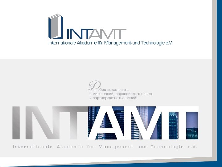 ОСНОВНЫЕ ДАННЫЕ ОБ INTAMT e. V. Ш Международная Академия управления и технологий INTAMT e. V. зарегистрирована в апреле 2005 года в Дюссельдорфе (Германия) как образовательное учреждение Ш Основная сфера деятельности INTAMT e. V. – реализация образовательных проектов по повышению квалификации специалистов в следующих областях: Ш Образование и наука Ш Инновационный менеджмент и инновационные технологии Ш Государственное и муниципальное управление Ш Организация жилищно-коммунальной сферы Ш Планирование территорий и строительство Ш Энергоэффективность, энергосбережение, возобновляемая энергетика Ш Ресурсосбережение и охрана окружающей среды Ш Социальная защита населения и организация здравоохранения Ш INTAMT e. V. – официальный партнер проекта „Research in Germany: Land of Ideas“ ( «Германия – страна идей» ) с правом представлять образовательный, научно-исследовательский и инновационный потенциал Германии на выставках, конгрессах и форумах в России и СНГ