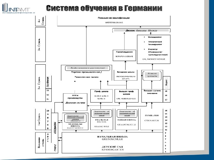 ОСОБЕННОСТИ СИСТЕМЫ ОБРАЗОВАНИЯ Ш Предмет дискуссий: разделение детей по типам школы в 4 классе Ш Компромисс: совмещенная школа, разделение детей в 6 классе Ш Ранняя профориентация под руководством специалистов (Дюссельдорфская модель) Ш Основа профобразования – «Дуальное обучение» – совмещение практического обучения на предприятиях (2 -3 дня в неделю) и теоретического обучения в профучилищах (2 -3 дня в неделю) Ш Договор найма с предприятием→направление ученика в учебные заведения профобразования Ш 643 000 предприятий участвуют в подготовке кадров Ш Подготовкой кадров на предприятии могут заниматься только лица с квалификацией «Мастер» Ш Квалификационные экзамены – независимая комиссия региональных Торгово-промышленных или Ремесленных палат