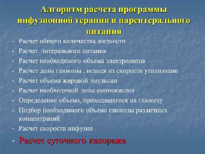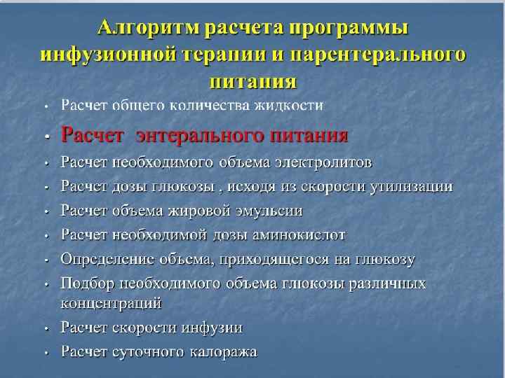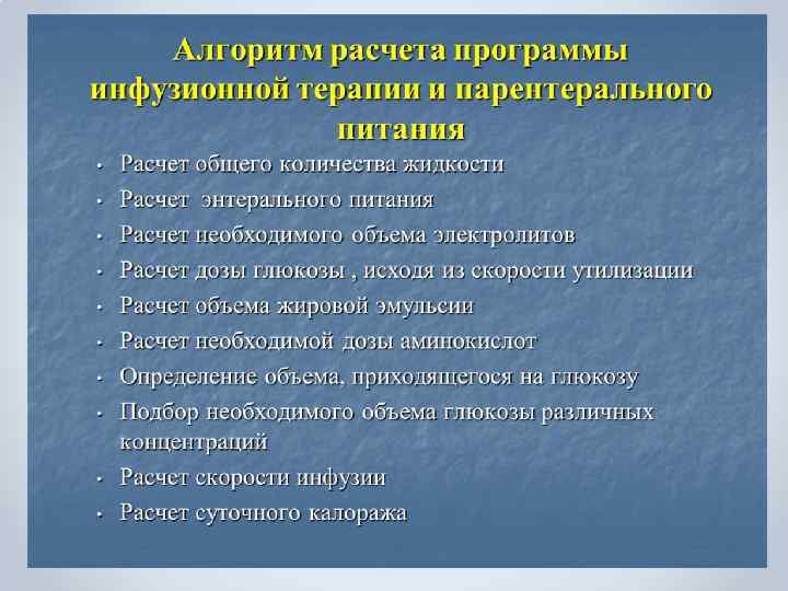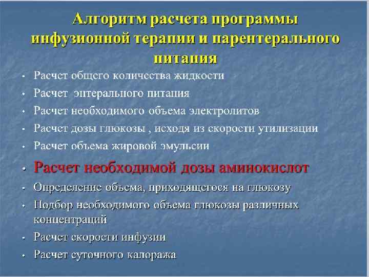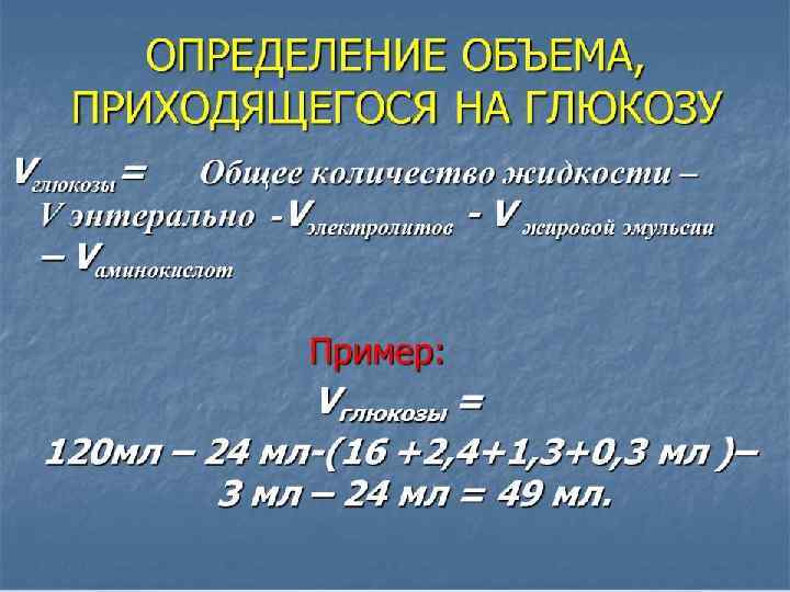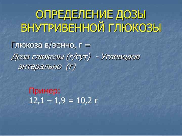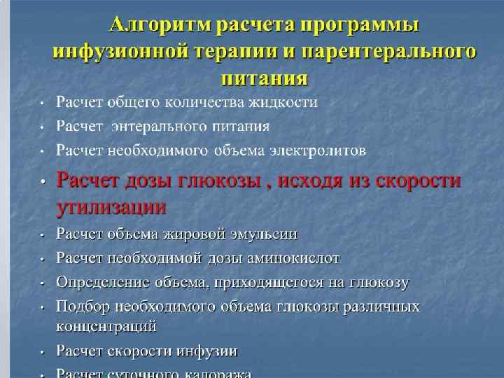 до 12 мг/кг/сут. В случае переносимости углеводной нагрузки ( глюкоза крови не более 8 мкмоль/л) углеводную нагрузку следует увеличивать ежедневно на 0, 5 -1 мг/кг/мин. Если уровень глюкозы крови составляет 8 -10 ммоль/л, углеводную нагрузку не следует увеличивать. При развитии гипергликемии на фоне инфузии глюкозы, достигающей более 10 -13 ммоль/л, снижают концентрацию вливаемой глюкозы. При отсутствии эффекта вводят инсулин в дозе 0, 1 Ед/кг/час.