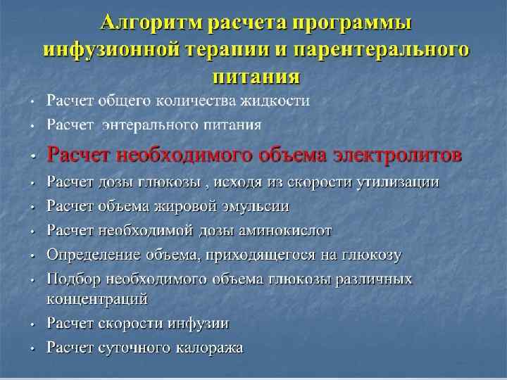 Показания для инфузионной терапии • Состояния, сопровождающиеся нарушениями процессов метаболизма и функции жизненноважных органов (асфиксия, ГБН, Сепсис, декомпенсированная НК) • Состояния, сопровождающиеся нарушенной толерантностью к энтеральной нагрузке • Незрелость органов и систем регуляции водноэлектролитного баланса и толерантность к энтеральному питанию у глубоконедоношенных детей
