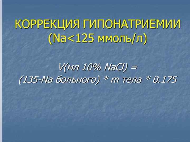 Клинико-лабораторный контроль 1. Массой тела (1 -2 раза в сутки) 2. Количеством поступивших всеми путями жидкости и электролитов 3. Потерями жидкости и электролитов с диурезом и стулом 4. Уровнем электролитов плазмы и крови 5. Уровнем креатинина и мочевины плазмы крови 6. Патологическими потерями воды и электролитов (желудочный застой, срыгивания, диарея, дренажи и т. д. ) 7. Функцией почек (относительная плотность и осмолярность мочи)