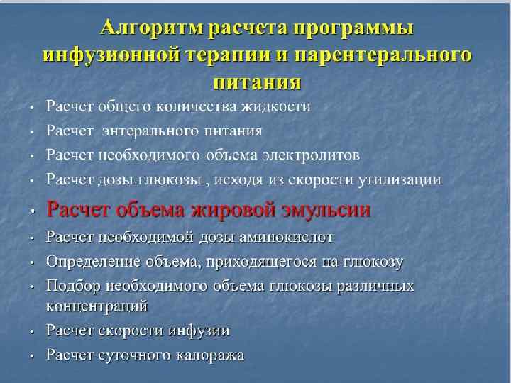 жиры • Наименьшее число осложнений вызывает применение 20% жировой эмульсии. • Инфузия жировой эмульсии должна проводиться равномерно и постоянно в течение суток. • Контроль безопасности вводимого количества жиров проводится на основании контроля уровня триглицеридов (2, 26 -2, 8 ммоль/л) или тестом на прозрачность сыворотки.