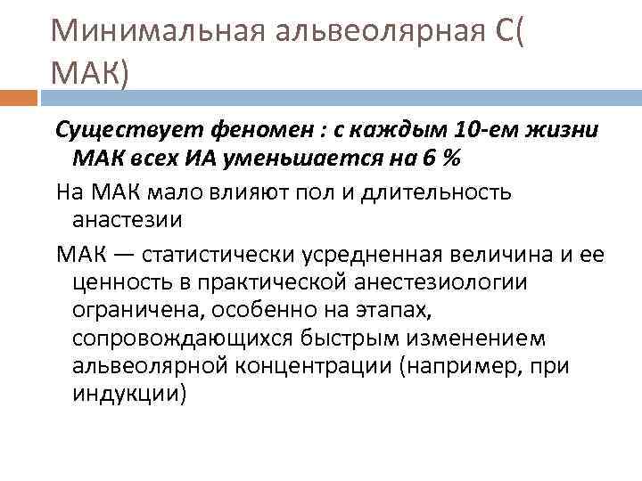 Минимальная альвеолярная С( МАК) Существует феномен : с каждым 10 -ем жизни МАК всех ИА уменьшается на 6 % На МАК мало влияют пол и длительность анастезии МАК — статистически усредненная величина и ее ценность в практической анестезиологии ограничена, особенно на этапах, сопровождающихся быстрым изменением альвеолярной концентрации (например, при индукции)
