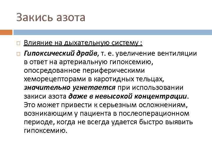 Закись азота Влияние на дыхательную систему : Гипоксический драйв, т. е. увеличение вентиляции в ответ на артериальную гипоксемию, опосредованное периферическими хеморецепторами в каротидных тельцах, значительно угнетается при использовании закиси азота даже в невысокой концентрации. Это может привести к серьезным осложнениям, возникающим у пациента в послеоперационном периоде, когда не всегда удается быстро выявить гипоксемию.