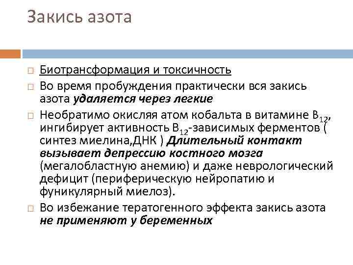 Закись азота Биотрансформация и токсичность Во время пробуждения практически вся закись азота удаляется через легкие Необратимо окисляя атом кобальта в витамине B 12, ингибирует активность В 12 -зависимых ферментов ( синтез миелина, ДНК ) Длительный контакт вызывает депрессию костного мозга (мегалобластную анемию) и даже неврологический дефицит (периферическую нейропатию и фуникулярный миелоз). Во избежание тератогенного эффекта закись азота не применяют у беременных
