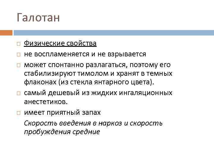 Галотан Физические свойства не воспламеняется и не взрывается может спонтанно разлагаться, поэтому его стабилизируют тимолом и хранят в темных флаконах (из стекла янтарного цвета). самый дешевый из жидких ингаляционных анестетиков. имеет приятный запах Скорость введения в наркоз и скорость пробуждения средние