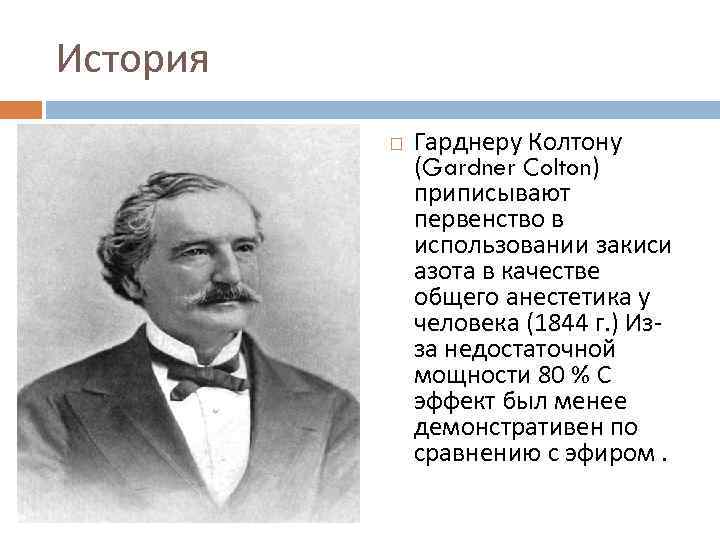 История Гарднеру Колтону (Gardner Colton) приписывают первенство в использовании закиси азота в качестве общего анестетика у человека (1844 г. ) Из- за недостаточной мощности 80 % С эффект был менее демонстративен по сравнению с эфиром.