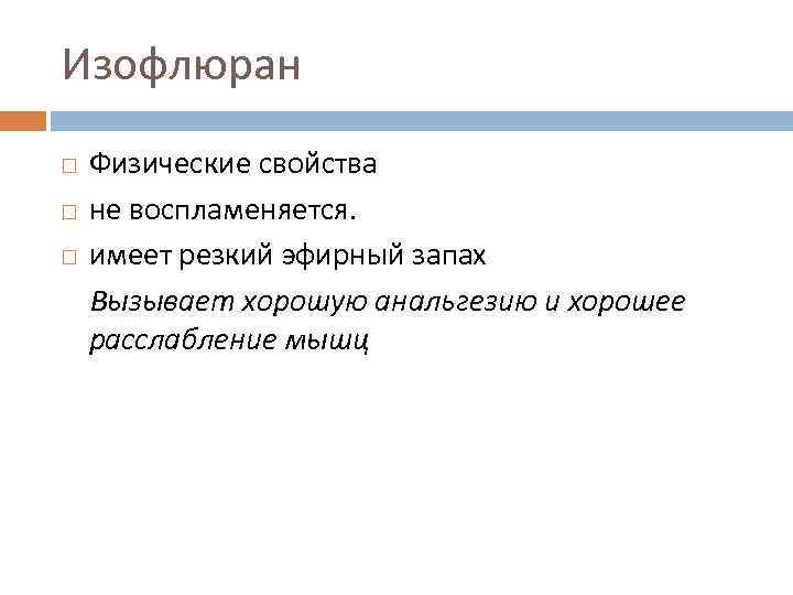 Изофлюран Физические свойства не воспламеняется. имеет резкий эфирный запах Вызывает хорошую анальгезию и хорошее расслабление мышц