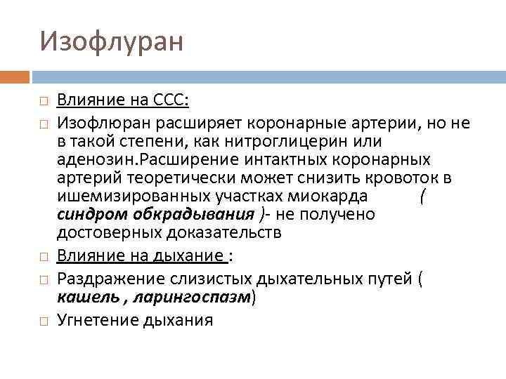 Изофлуран Влияние на ССС: Изофлюран расширяет коронарные артерии, но не в такой степени, как нитроглицерин или аденозин. Расширение интактных коронарных артерий теоретически может снизить кровоток в ишемизированных участках миокарда ( синдром обкрадывания )- не получено достоверных доказательств Влияние на дыхание : Раздражение слизистых дыхательных путей ( кашель , ларингоспазм) Угнетение дыхания