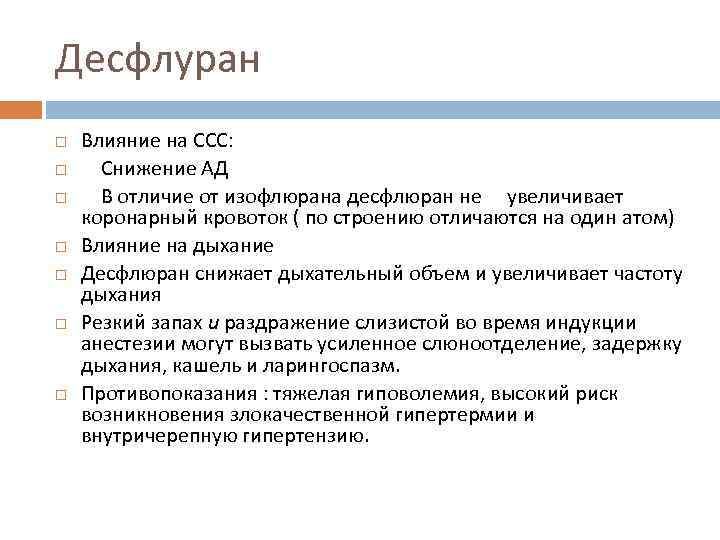 Десфлуран Влияние на ССС: Снижение АД В отличие от изофлюрана десфлюран не увеличивает коронарный кровоток ( по строению отличаются на один атом) Влияние на дыхание Десфлюран снижает дыхательный объем и увеличивает частоту дыхания Резкий запах и раздражение слизистой во время индукции анестезии могут вызвать усиленное слюноотделение, задержку дыхания, кашель и ларингоспазм. Противопоказания : тяжелая гиповолемия, высокий риск возникновения злокачественной гипертермии и внутричерепную гипертензию.