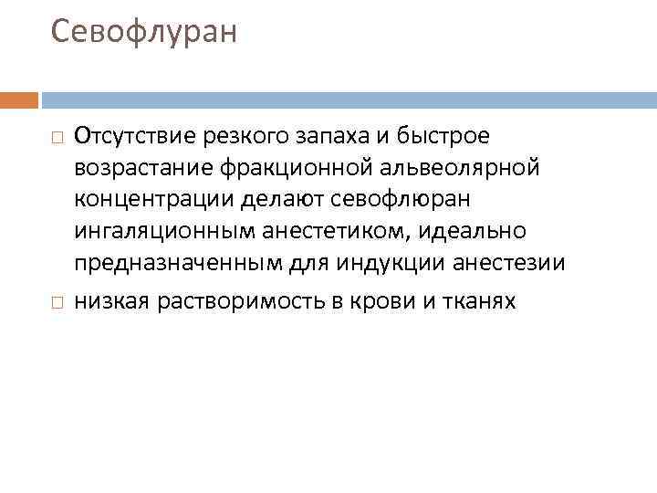 Севофлуран Отсутствие резкого запаха и быстрое возрастание фракционной альвеолярной концентрации делают севофлюран ингаляционным анестетиком, идеально предназначенным для индукции анестезии низкая растворимость в крови и тканях