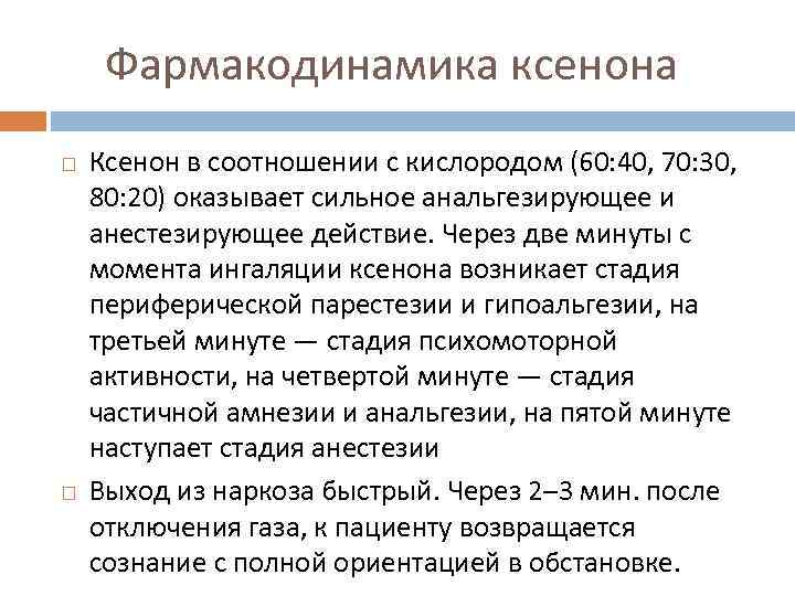 Фармакодинамика ксенона Ксенон в соотношении с кислородом (60: 40, 70: 30, 80: 20) оказывает сильное анальгезирующее и анестезирующее действие. Через две минуты с момента ингаляции ксенона возникает стадия периферической парестезии и гипоальгезии, на третьей минуте — стадия психомоторной активности, на четвертой минуте — стадия частичной амнезии и анальгезии, на пятой минуте наступает стадия анестезии Выход из наркоза быстрый. Через 2– 3 мин. после отключения газа, к пациенту возвращается сознание с полной ориентацией в обстановке.