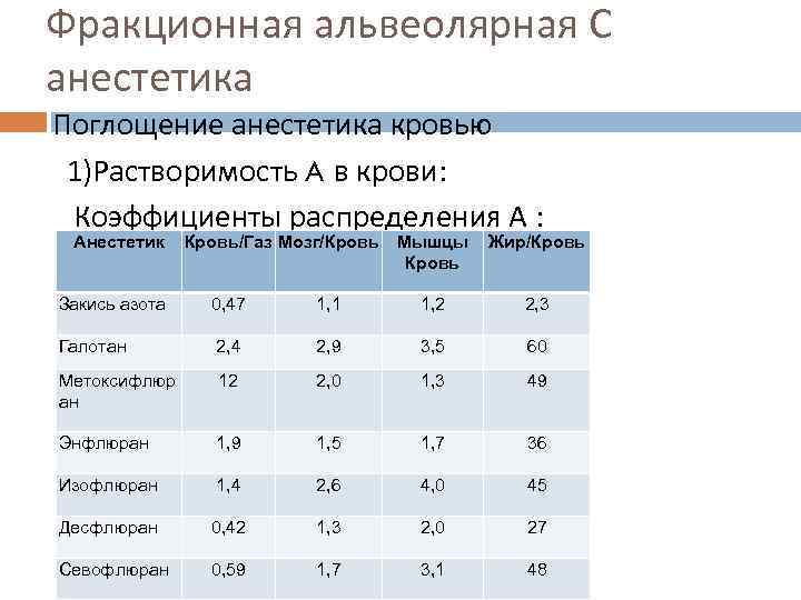 Фракционная альвеолярная С анестетика Поглощение анестетика кровью 1)Растворимость A в крови: Коэффициенты распределения А : Анестетик Кровь/Газ Мозг/Кровь Мышцы Жир/Кровь Кровь Закись азота 0, 47 1, 1 1, 2 2, 3 Галотан 2, 4 2, 9 3, 5 60 Метоксифлюр 12 2, 0 1, 3 49 ан Энфлюран 1, 9 1, 5 1, 7 36 Изофлюран 1, 4 2, 6 4, 0 45 Десфлюран 0, 42 1, 3 2, 0 27 Севофлюран 0, 59 1, 7 3, 1 48