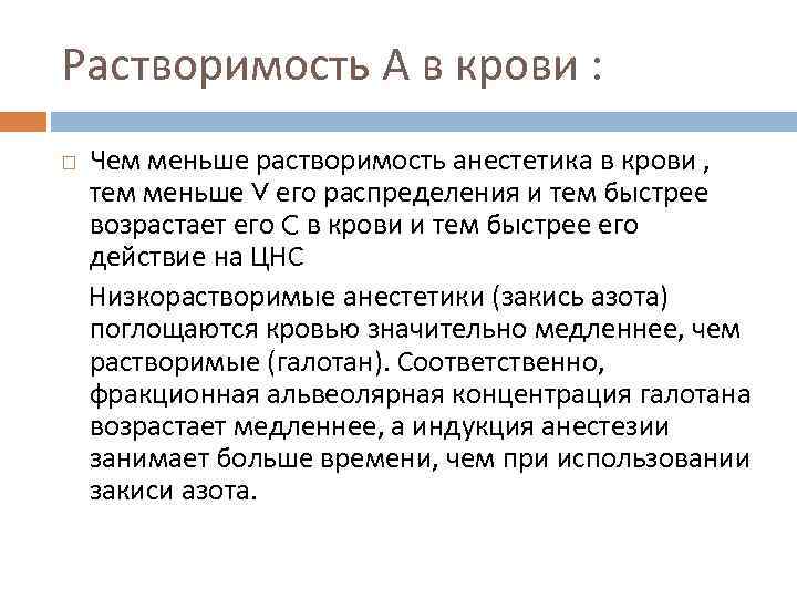 Растворимость А в крови : Чем меньше растворимость анестетика в крови , тем меньше V его распределения и тем быстрее возрастает его C в крови и тем быстрее его действие на ЦНС Низкорастворимые анестетики (закись азота) поглощаются кровью значительно медленнее, чем растворимые (галотан). Соответственно, фракционная альвеолярная концентрация галотана возрастает медленнее, а индукция анестезии занимает больше времени, чем при использовании закиси азота.