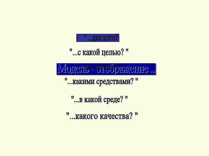 Качества моделей определяют ценность самого результата моделирования, т. е. отношение моделей с отображаемой ими реальностью: Чем отличаются МОДЕЛИ и моделируемые ОБЪЕКТЫ и явления Различие между моделью и действительностью В каком смысле и до какой степени можно отождествлять ЦЕЛЬ с ОРИГИНАЛОМ? Сходство между моделью и действительностью