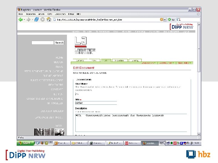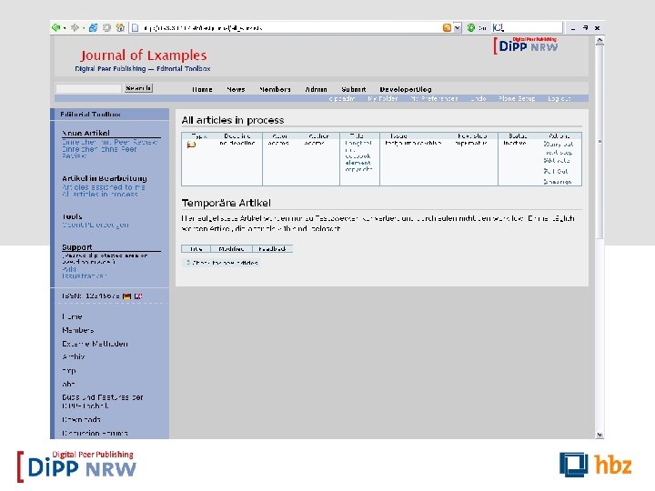 Di. PP-Services … Distribution indexing in search engines / databases - z. B. ISSN, EZB, DOAJ, OAISTER automat. notification of metadata and articles - via OAI-PMH / e. Mail-Alert disciplinary forms for metadata- DDC, PAC etc. tools and scripts for exact and ‚clean‘ statistics– AWstats, Custom (Python) Workflow systems Forms, worklists and views for authors, editors and reviewers scalability - Blind, Double-Blind etc. Training / knowledge transfer workshops and intra-network exchange - Workshops, Training, Lists, WIKI