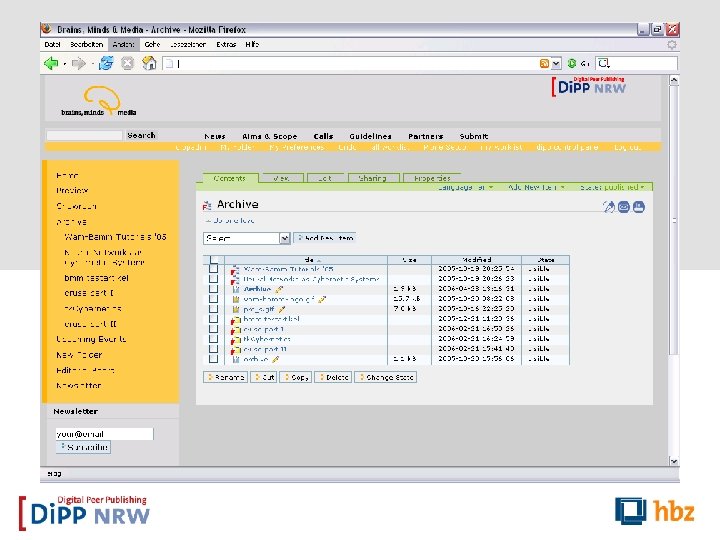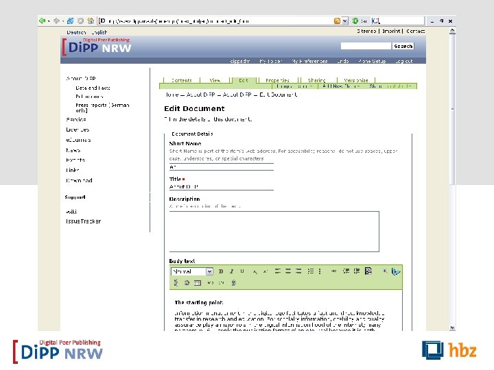 Di. PP-Services Hosting and Archiving powerful and secure Hardware and Software – Fedora / Zope-Plone "persistent Identifiers" for primary Publications - URN open archival format - XML preparation for long-term archiving Production system individual layout simple editing of editorial contents - WYSIWYG autom. article conversion with stylesheets - RTF/La. Te. X -> XML <- HTML/PDF messaging - Lists/RSS-Feeds Licence-Management automated licence management: integration in metadata and articles „some rights reserved“ – CC to be included Digital Peer Publishing Licence – modules for scholarly communication – DPPL …