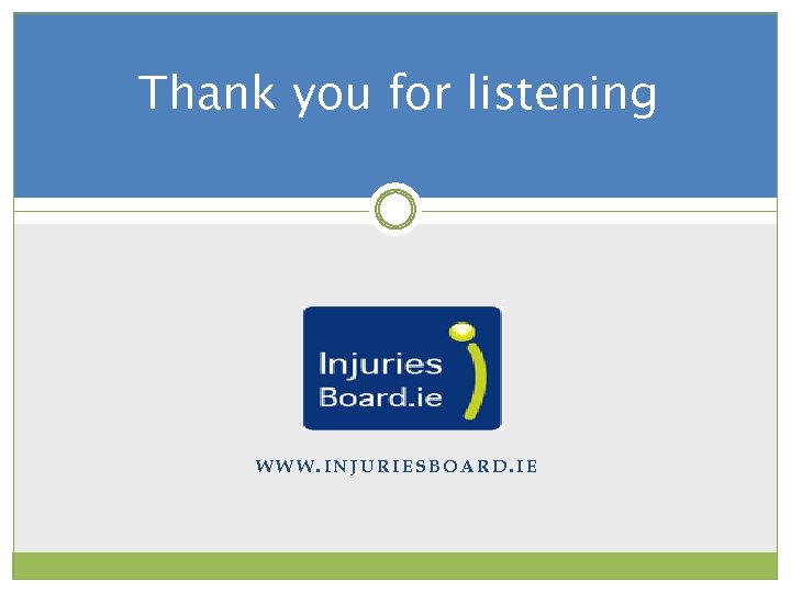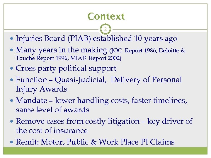 Context 2 Injuries Board (PIAB) established 10 years ago Many years in the making (JOC Report 1986, Deloitte & Touche Report 1996, MIAB Report 2002) Cross party political support Function – Quasi-Judicial, Delivery of Personal Injury Awards Mandate – lower handling costs, faster timelines, same level of awards Remove cases from costly litigation – key driver of the cost of insurance Remit: Motor, Public & Work Place PI Claims
