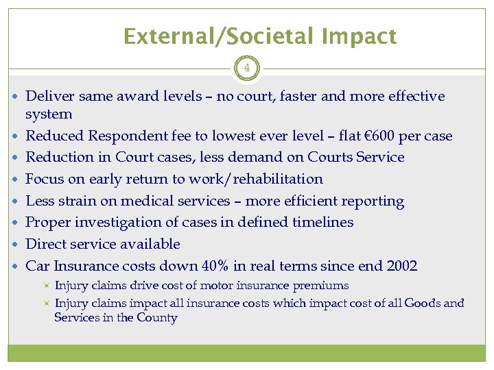 Results to date – key indicators 3 Over 70, 000 awards made to date Over € 1. 5 billion assessed in compensation Highest Award to date - € 1 million Timelines – 7. 3 months versus 3 years Consistency of awards – Book of Quantum Savings € 500 m direct * € 500 m indirect from settlements * Total € 1 billion * Delivery costs – < 8. 0% (Litigation 2004: 46% 2013: 58%) * based on current litigation costs of 58%