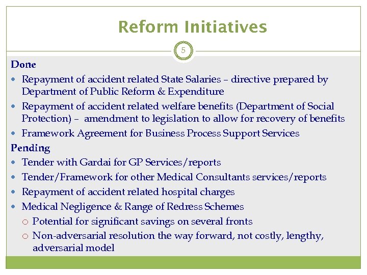 Reform Initiatives 5 Done Repayment of accident related State Salaries – directive prepared by Department of Public Reform & Expenditure Repayment of accident related welfare benefits (Department of Social Protection) – amendment to legislation to allow for recovery of benefits Framework Agreement for Business Process Support Services Pending Tender with Gardai for GP Services/reports Tender/Framework for other Medical Consultants services/reports Repayment of accident related hospital charges Medical Negligence & Range of Redress Schemes Potential for significant savings on several fronts Non-adversarial resolution the way forward, not costly, lengthy, adversarial model