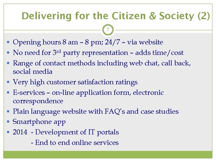 Delivering for the Citizen & Society (2) 7 Opening hours 8 am – 8 pm; 24/7 – via website No need for 3 rd party representation – adds time/cost Range of contact methods including web chat, call back, social media Very high customer satisfaction ratings E-services – on-line application form, electronic correspondence Plain language website with FAQ’s and case studies Smartphone app 2014 - Development of IT portals - End to end online services
