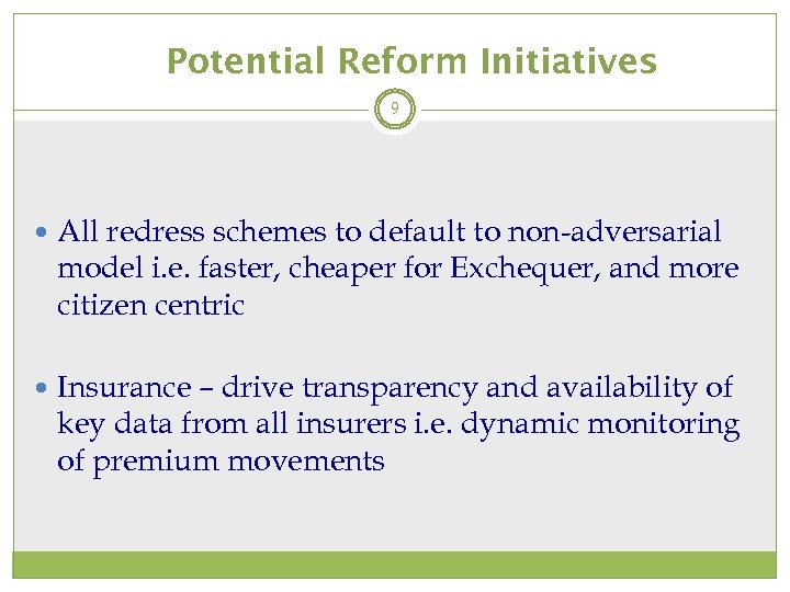 Potential Reform Initiatives 9 All redress schemes to default to non-adversarial model i. e. faster, cheaper for Exchequer, and more citizen centric Insurance – drive transparency and availability of key data from all insurers i. e. dynamic monitoring of premium movements