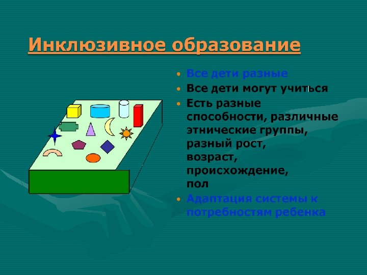 ИНКЛЮЗИВНОЕ (включающее) ОБРАЗОВАНИЕ – это образование, при котором все дети, несмотря на свои физические, интеллектуальные и иные особенности, включены в общую систему образования и обучаются в общеобразовательных школах вместе со своими сверстниками. • Инклюзия означает раскрытие каждого ученика с помощью образовательной программы, которая достаточно сложна, но соответствует его способностям. • Инклюзия учитывает потребности, также как и специальные условия и поддержку, необходимые ученику и учителям для достижения успеха.