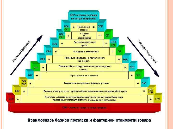 РАСПРЕДЕЛЕНИЕ РАСХОДОВ ПО ДОСТАВКЕ И ТАМОЖЕННОМ ОФОРМЛЕНИИ ТОВАРА МЕЖДУ ПРОДАВЦОМ И ПОКУПАТЕЛЕМ В ЗАВИСИМОСТИ ОТ БАЗИСА ПОСТАВКИ, ЕВРО Условия EXW FAS FOB C IF DDU DDP поставки Париж Марсель Новорос Москва сийск Продаве ц 0 1200 1400 3400 4750 41872 Покупат ель 42022 40822 40622 38622 37272 150