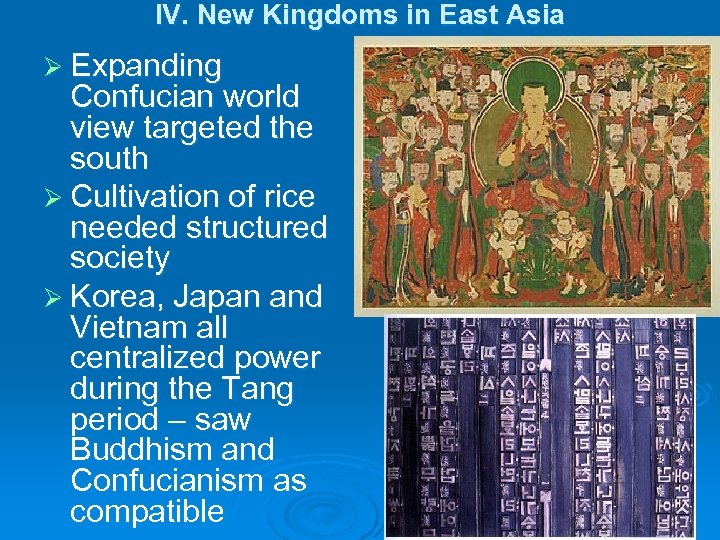 IV. New Kingdoms in East Asia Ø Expanding Confucian world view targeted the south Ø Cultivation of rice needed structured society Ø Korea, Japan and Vietnam all centralized power during the Tang period – saw Buddhism and Confucianism as compatible