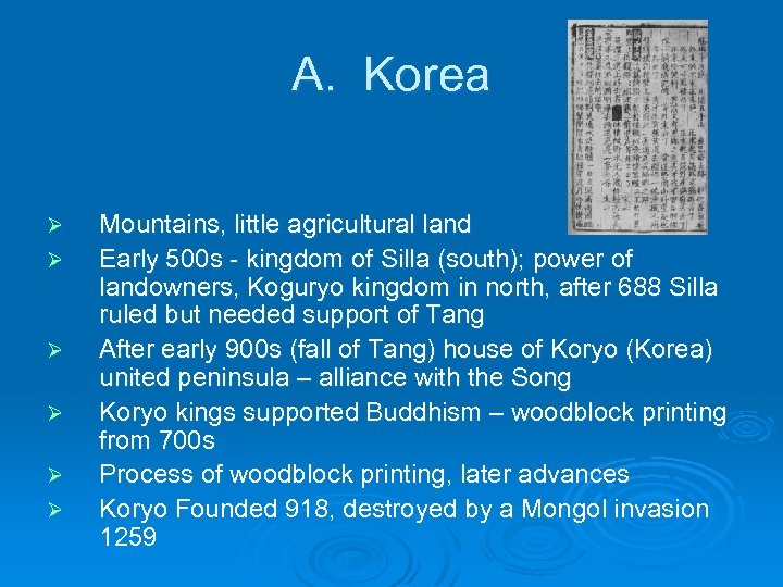 A. Korea Ø Ø Ø Mountains, little agricultural land Early 500 s - kingdom of Silla (south); power of landowners, Koguryo kingdom in north, after 688 Silla ruled but needed support of Tang After early 900 s (fall of Tang) house of Koryo (Korea) united peninsula – alliance with the Song Koryo kings supported Buddhism – woodblock printing from 700 s Process of woodblock printing, later advances Koryo Founded 918, destroyed by a Mongol invasion 1259
