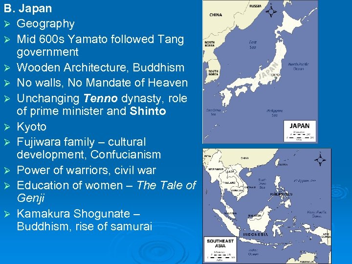 B. Japan Ø Geography Ø Mid 600 s Yamato followed Tang government Ø Wooden Architecture, Buddhism Ø No walls, No Mandate of Heaven Ø Unchanging Tenno dynasty, role of prime minister and Shinto Ø Kyoto Ø Fujiwara family – cultural development, Confucianism Ø Power of warriors, civil war Ø Education of women – The Tale of Genji Ø Kamakura Shogunate – Buddhism, rise of samurai