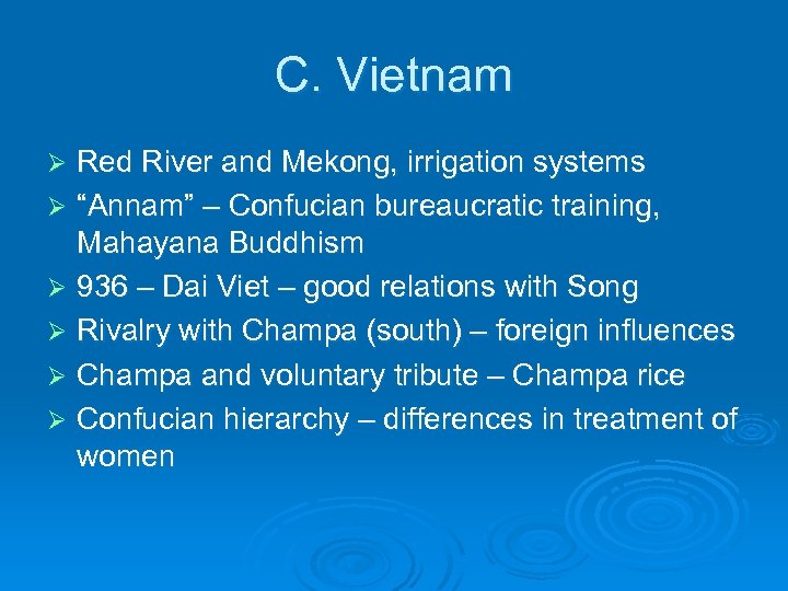 C. Vietnam Red River and Mekong, irrigation systems Ø “Annam” – Confucian bureaucratic training, Mahayana Buddhism Ø 936 – Dai Viet – good relations with Song Ø Rivalry with Champa (south) – foreign influences Ø Champa and voluntary tribute – Champa rice Ø Confucian hierarchy – differences in treatment of women Ø