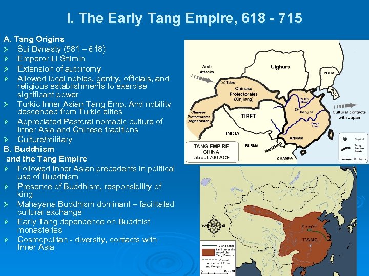 I. The Early Tang Empire, 618 - 715 A. Tang Origins Ø Sui Dynasty (581 – 618) Ø Emperor Li Shimin Ø Extension of autonomy Ø Allowed local nobles, gentry, officials, and religious establishments to exercise significant power Ø Turkic Inner Asian-Tang Emp. And nobility descended from Turkic elites Ø Appreciated Pastoral nomadic culture of Inner Asia and Chinese traditions Ø Culture/military B. Buddhism and the Tang Empire Ø Followed Inner Asian precedents in political use of Buddhism Ø Presence of Buddhism, responsibility of king Ø Mahayana Buddhism dominant – facilitated cultural exchange Ø Early Tang dependence on Buddhist monasteries Ø Cosmopolitan - diversity, contacts with Inner Asia