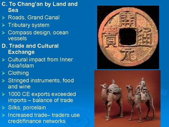 C. To Chang’an by Land Sea Ø Roads, Grand Canal Ø Tributary system Ø Compass design, ocean vessels D. Trade and Cultural Exchange Ø Cultural impact from Inner Asia/Islam Ø Clothing Ø Stringed instruments, food and wine Ø 1000 CE exports exceeded imports – balance of trade Ø Silks, porcelain Ø Increased trade– traders use credit/finance networks