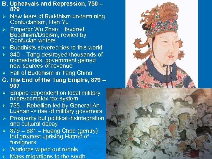 B. Upheavals and Repression, 750 – 879 Ø New fears of Buddhism undermining Confucianism, Han Yu Ø Emperor Wu Zhao – favored Buddhism/Daoism, reviled by Confucian writers Ø Buddhists severed ties to this world Ø 840 – Tang destroyed thousands of monasteries, government gained new sources of revenue Ø Fall of Buddhism in Tang China C. The End of the Tang Empire, 879 – 907 Ø Empire dependent on local military rulers/complex tax system Ø 755 – Rebellion led by General An Lushan -> rise of military governors Ø Prosperity but political disintegration and cultural decay Ø 879 – 881 – Huang Chao (gentry) led greatest uprising Hatred of foreigners Ø Warlords wiped out rebels Ø Mass migrations to the south