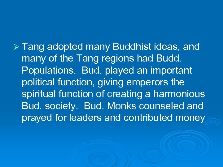 Ø Tang adopted many Buddhist ideas, and many of the Tang regions had Budd. Populations. Bud. played an important political function, giving emperors the spiritual function of creating a harmonious Bud. society. Bud. Monks counseled and prayed for leaders and contributed money
