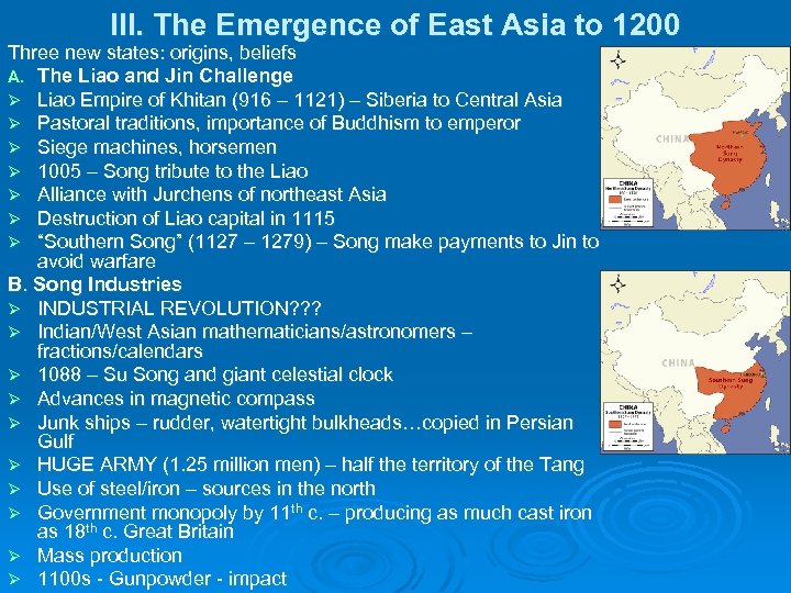 III. The Emergence of East Asia to 1200 Three new states: origins, beliefs A. The Liao and Jin Challenge Ø Liao Empire of Khitan (916 – 1121) – Siberia to Central Asia Ø Pastoral traditions, importance of Buddhism to emperor Ø Siege machines, horsemen Ø 1005 – Song tribute to the Liao Ø Alliance with Jurchens of northeast Asia Ø Destruction of Liao capital in 1115 Ø “Southern Song” (1127 – 1279) – Song make payments to Jin to avoid warfare B. Song Industries Ø INDUSTRIAL REVOLUTION? ? ? Ø Indian/West Asian mathematicians/astronomers – fractions/calendars Ø 1088 – Su Song and giant celestial clock Ø Advances in magnetic compass Ø Junk ships – rudder, watertight bulkheads…copied in Persian Gulf Ø HUGE ARMY (1. 25 million men) – half the territory of the Tang Ø Use of steel/iron – sources in the north Ø Government monopoly by 11 th c. – producing as much cast iron as 18 th c. Great Britain Ø Mass production Ø 1100 s - Gunpowder - impact