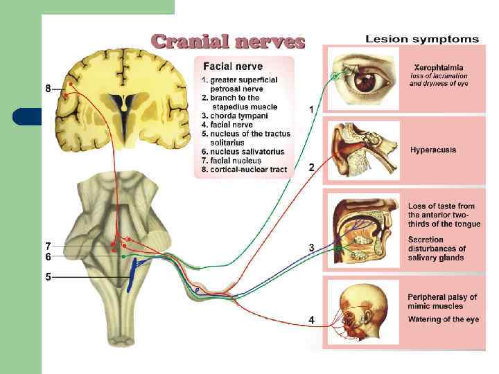 Симптомы поражения лицевого нерва до отхождения стременного нерва l l l 1. парез мимической мускулатуры 2. слезотечение 3. гиперакузия 4. нарушение вкуса на передних 2/3 языка 5. сухость во рту