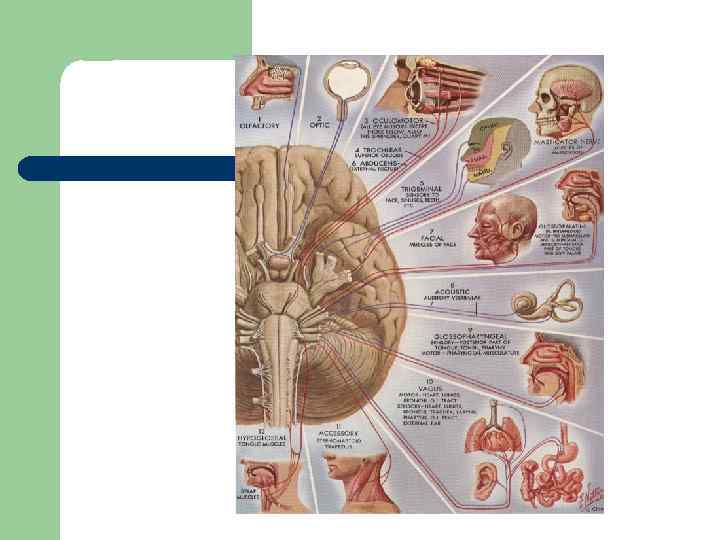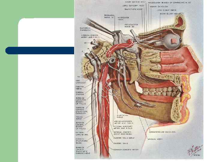 Верхнечелюстной нерв l l Менингеальная ветвь 1. узловой нерв (к крылонебному узлу) - большой и малые небные нервы, нижние задние носовые нервы - слизистая носовых раковин, гайморовой полости, слизистая неба l 2. скуловой нерв (передняя часть височной и задней части лобной участков, секреторные парасимпатические волокна слезной железы l 3. подглазничный нерв - верхние альвеолярные нервы (задние, средние, передние), нижние ветви век, внешние и внутренние носовые ветви, верхние губные ветви)