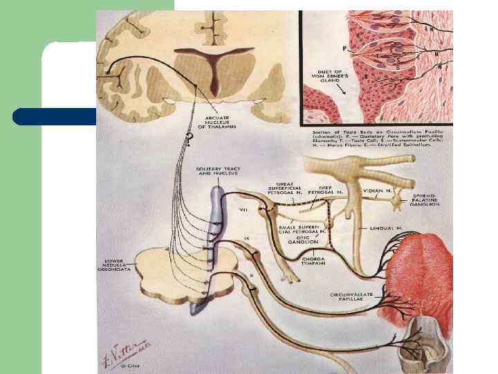 Чувствительная функция языкоглоточного нерва Вкусовая чувствительность - нижний яремный узел (gangl. jugularae inferius), А) Дендриты подходят к вкусовым сосочкам задней трети языка. Б) Аксоны - заканчиваются в ядрах одинокого пучка (nucl. tractus solitarii).